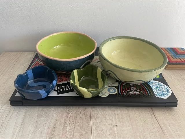 Bowl verdecito con líneas orgánicas azules, amo cómo quedó.