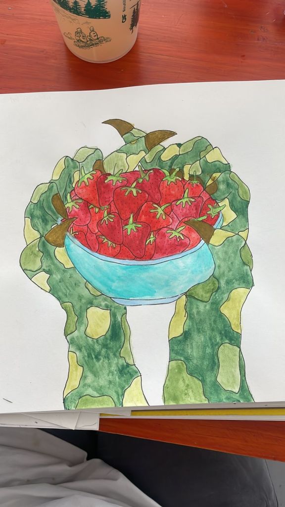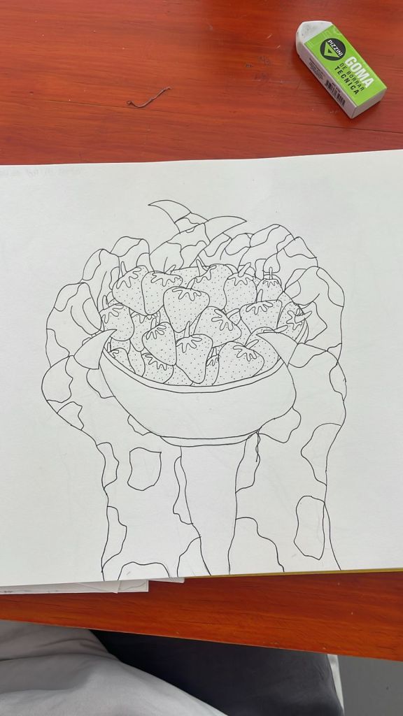 Dragón comiendo frutillas de un bowl. Blanco y negro y primera prueba de color con mis lápices acuarelables Carand’ache. Me gusta más el blanco y negro. Los lápices los hice acuarelables con un pincel y cambia el tono del color. Seguiré probando.